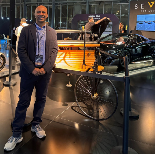 Sitting in the SEVEN Car Lounge booth like a temporal glitch: the actual Patent-Motorwagen. Not a replica. Not a “similar model.” The exact machine from Bertha’s revolution, here in the Saudi desert, at a drone show, four months after I’d written about her.